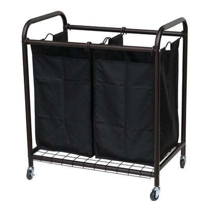 Bronze Laundry Hamper Cart with 2 Black Sorter Bags 2-removable bag compartments and hooks for sorting and organization 4-caster wheels and handles for easy transportation Made with metal steel for durability with netted bottom Can withstand heavy and frequent use Black PU fiber bags to withstand big loads of laundry and clean look Saves time by sorting and organizing your laundry as you go Color: Bronze Color/Finish: Bronze Included: No additional components included Laundry Storage Product Type: Laundry Sorter Material: Metal Sections: 2