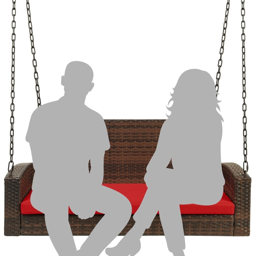 Brown Wicker Hanging Patio Porch Swing Bench w/ Mounting Chains and Red Seat Cushion
