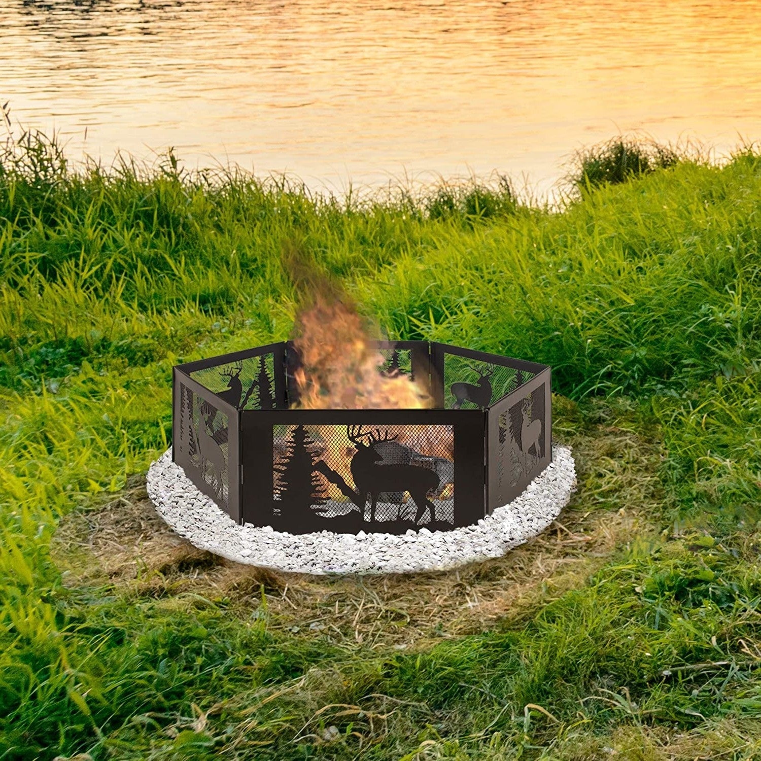 Deer Print Hexagon Portable Folding Steel Mesh Fire Pit w/ Carry Case