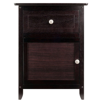 Espresso Wood End Table Nightstand Accent Table Rectangular end/accent table from Winsome Wood for living room or bedside use Beech wood construction with warm espresso finish Slightly tapered legs Equipped with 1 drawer and 1 single-shelf cabinet Home assembly required Comes with necessary tools and hardware Upon assembly, measures 19-inch wide by 15-inch deep by 25-inch high