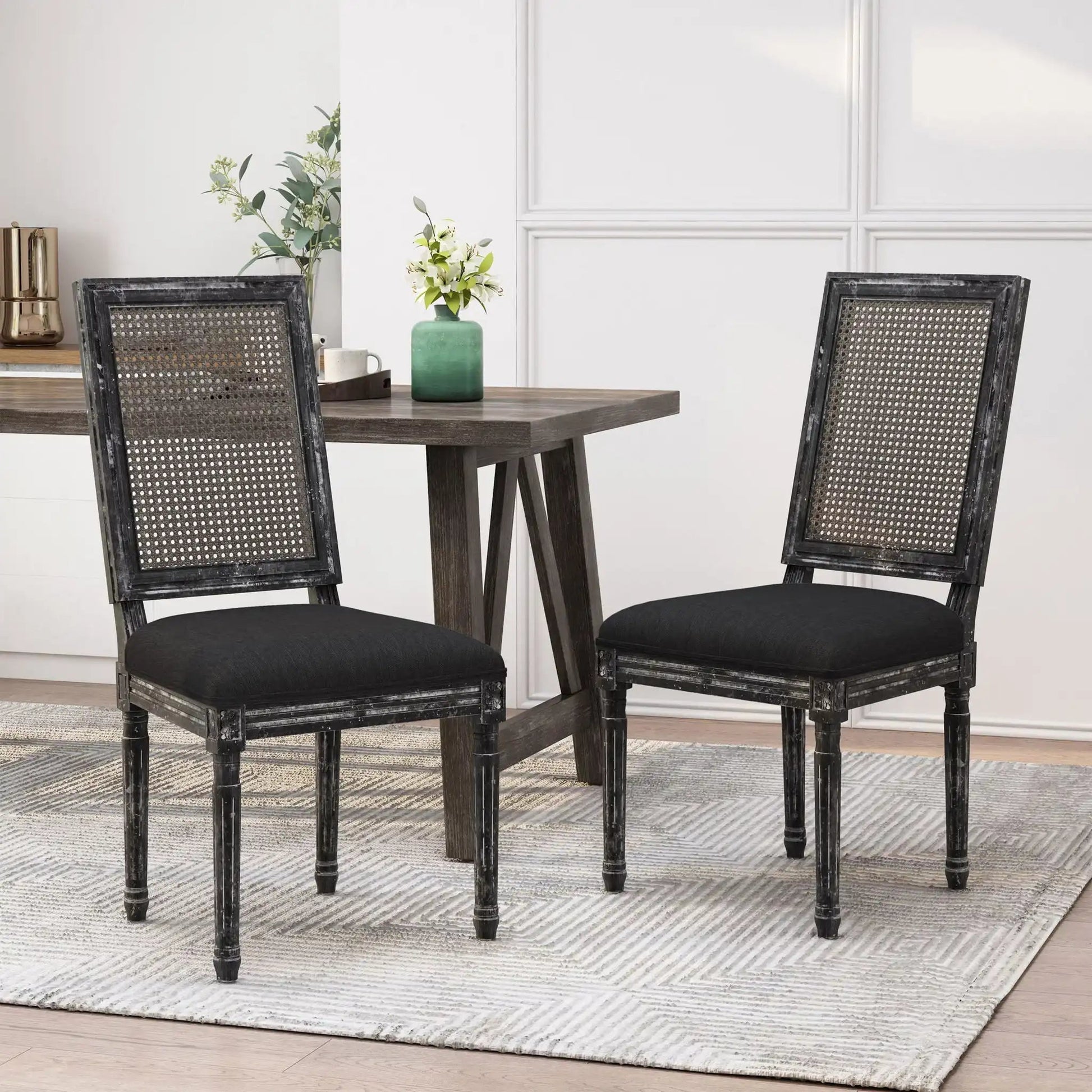 Vintage Inspired French Country Dining Chairs (Set of 2) With Cane Backrest & Upholstered Seats - Rustic Weathered