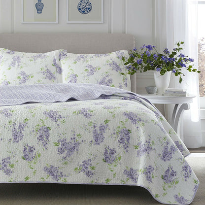 Full / Queen size 3-Piece Cotton Quilt Set with White Purple Floral Pattern