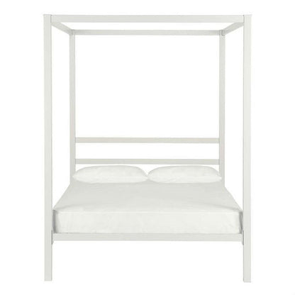 Full size Modern White Metal Canopy Bed Frame Modern style with square lines and a built-in headboard for a timeless look. Sturdy metal frame construction; includes metal side rails for guaranteed stability and durability. Includes metal slats as well as additional legs that provide extra support. No box spring required. Add curtains for a delicate and romantic look (sold separately) Weight limit is 450lbs.