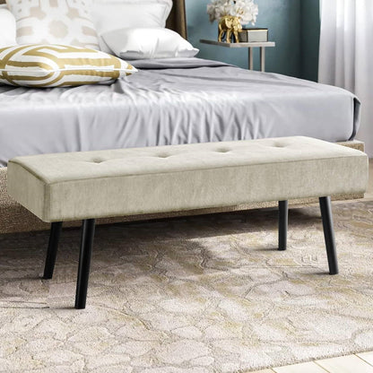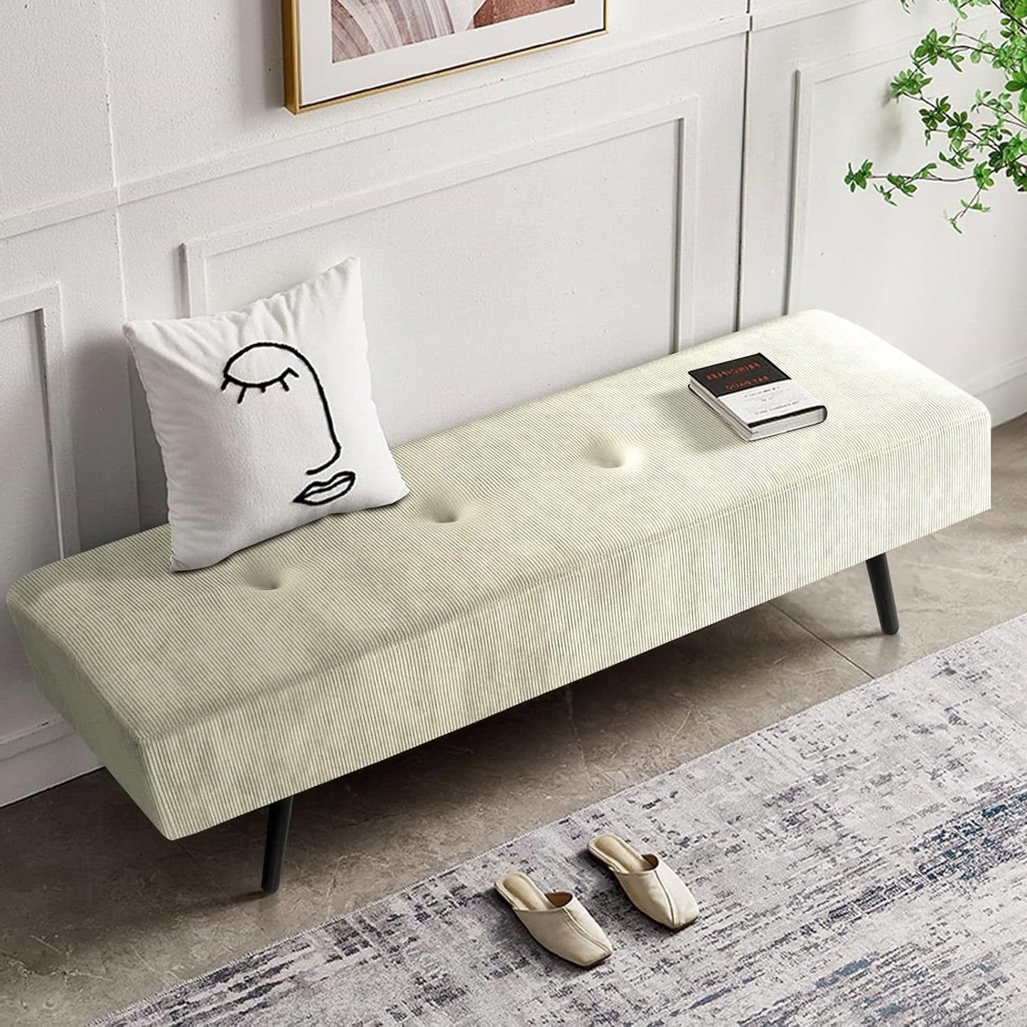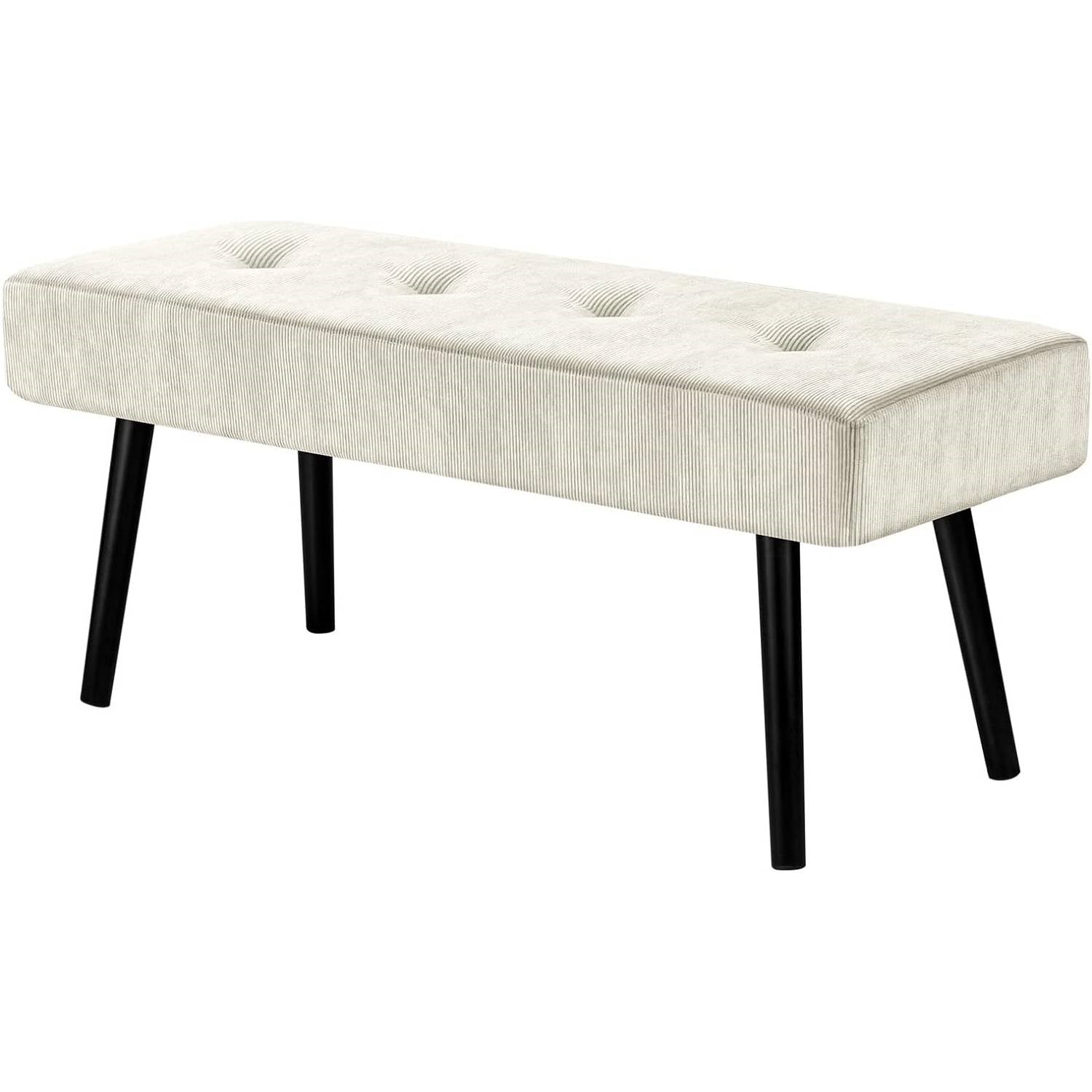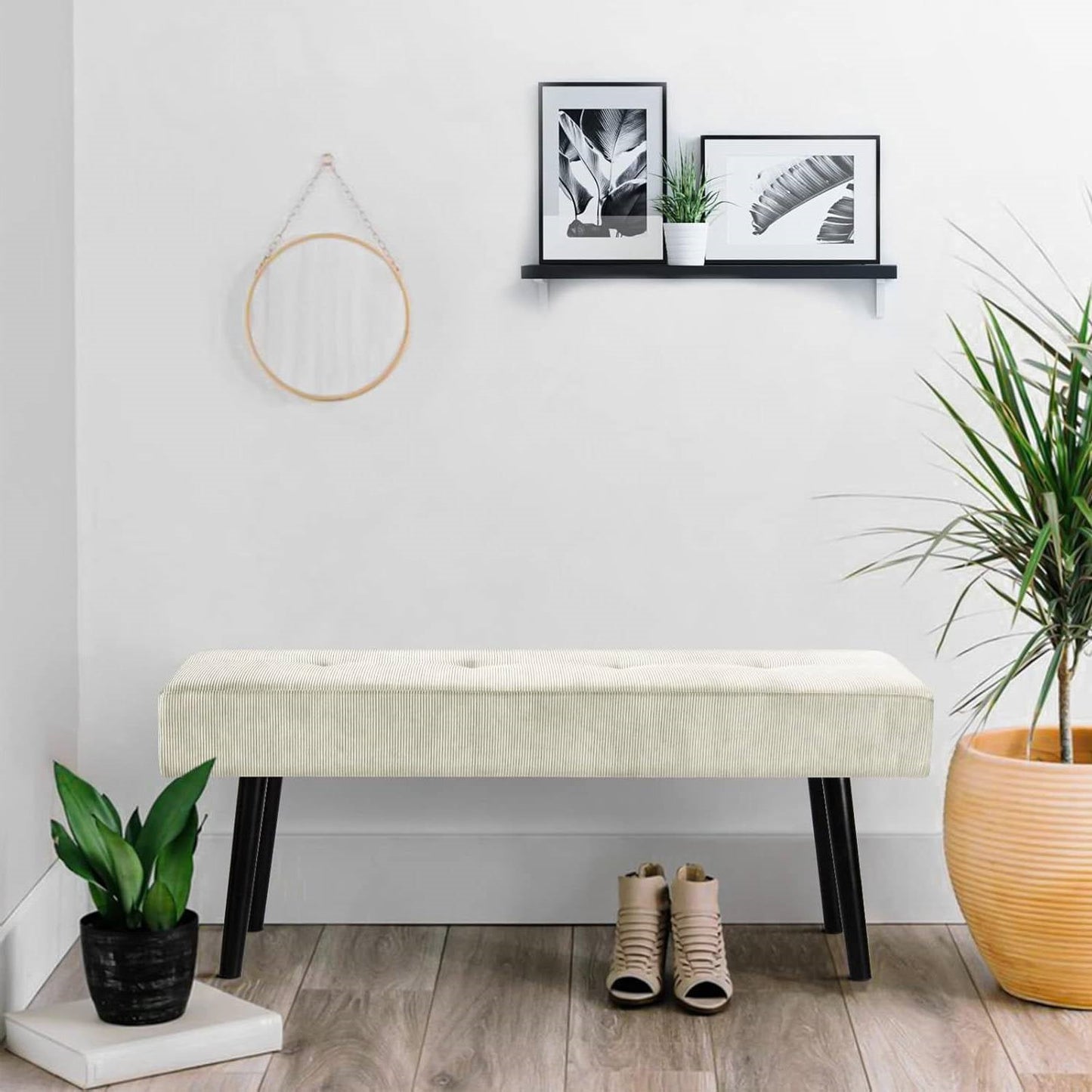 - Mid-Century Beige Corduroy Upholstered End of Bed Bench with Black Metal Legs