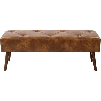 Mid-Century End of Bed Bench with Brown Leather Upholstered Seat Solid Wood Legs