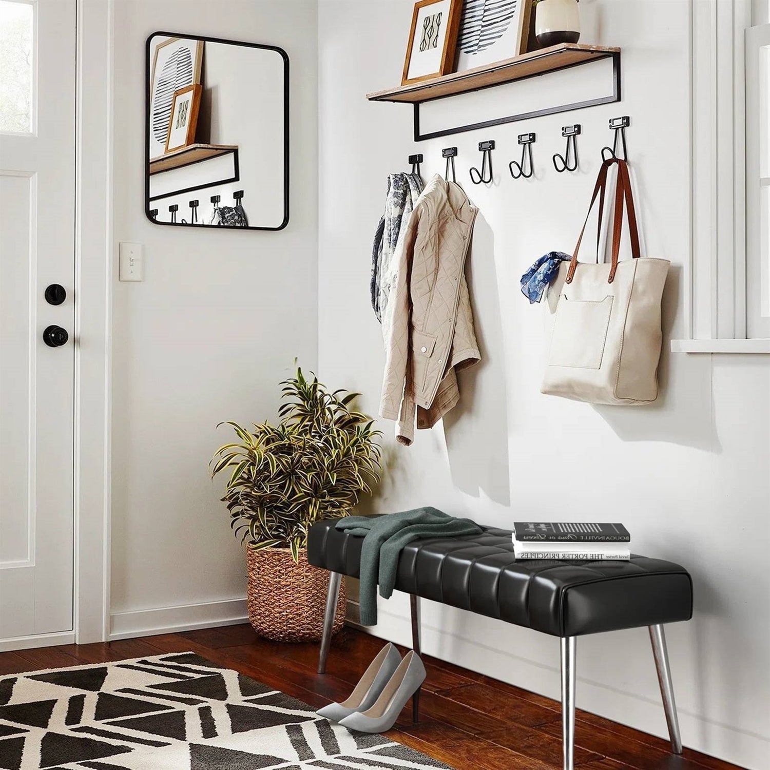 - Mid-Century Modern End of Bed Bench with Black PU Leather Seat and Tapered Legs
