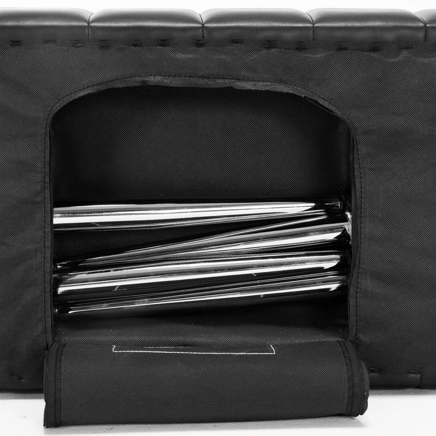 - Metal legs and screws are stored in the zipper compartment. You only need to spend 5 minutes using the provided screws to fix the metal legs, and then you can use the bench.