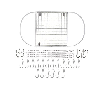 - Includes: 1 oval rack frame, 1 grid shelf, 4 lengths of chain, 4 ceiling hooks, 4 rack hooks, 12 pot hooks, 6 extra hooks