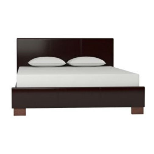 Queen-sized Platform bed (slats included; box spring not required) Rubberwood and engineered wood frame with brown wood legs Polyurethane foam padding Dark brown faux leather Assembly required Dimensions: 62.5 x 84.5 x 33.5 inches Weight: 59 Pounds