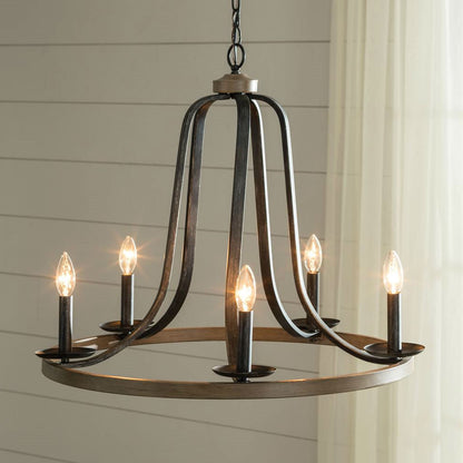 Rustic 5 Light Dimmable Farm Home Circle Metal Chandelier Oak Finish
