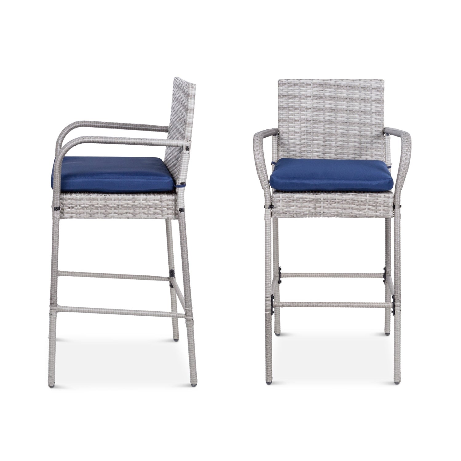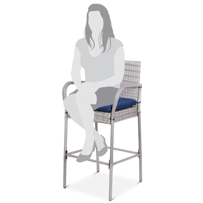 Set of 2 Grey Indoor/Outdoor Wicker Bar Stools w/ 2 Blue Cushions