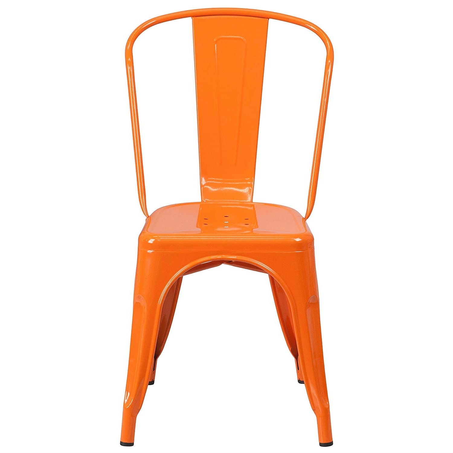 Set of 4 Outdoor Indoor Orange Metal Stacking Bistro Dining Chairs Set of 4 Stackable Bistro Style Chairs Stack Quantity: 8 Curved Back with Vertical Slat Seat Drain Holes assist in drying Orange Powder Coated Frame Finish