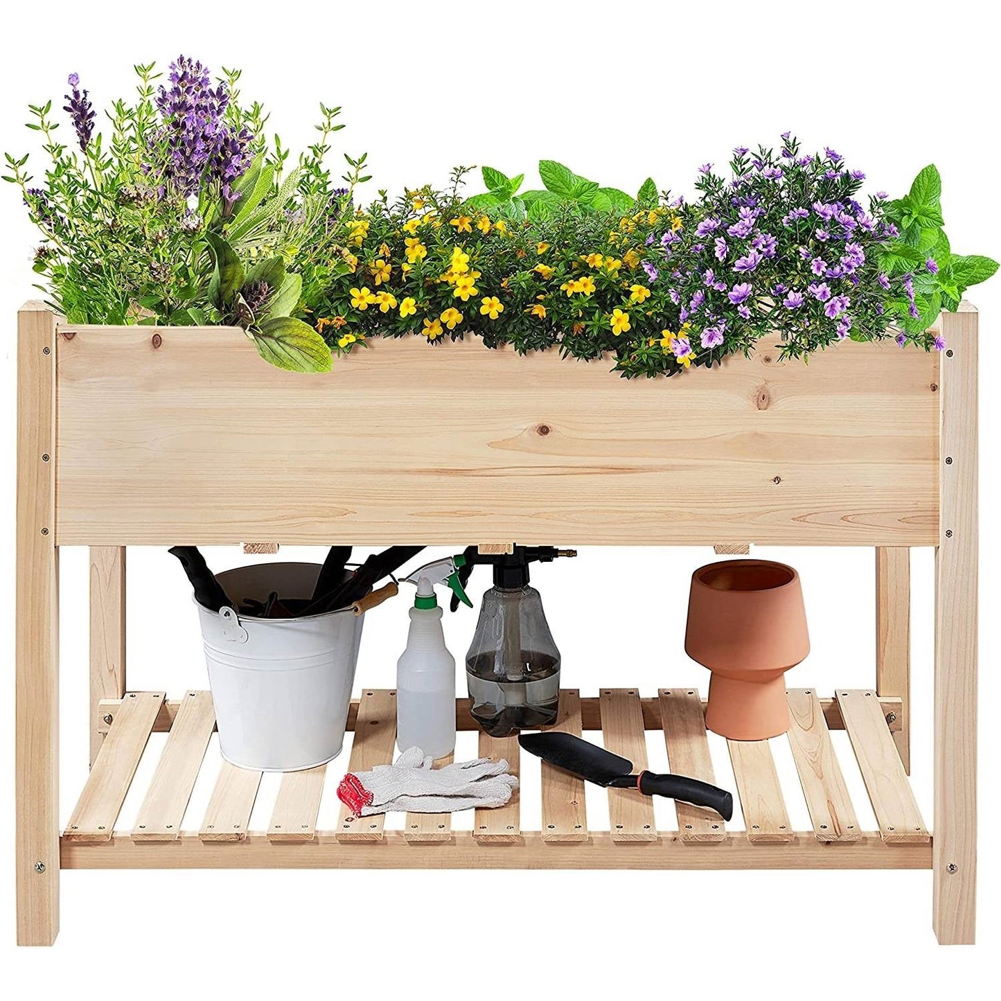 - THOUGHTFUL DESIGN: This raised planter bed has 2 tiers for planting and storing. The box is suitable for growing various plants and the lower shelf can be used for holding planting tools, small bonsai, or potted plants.