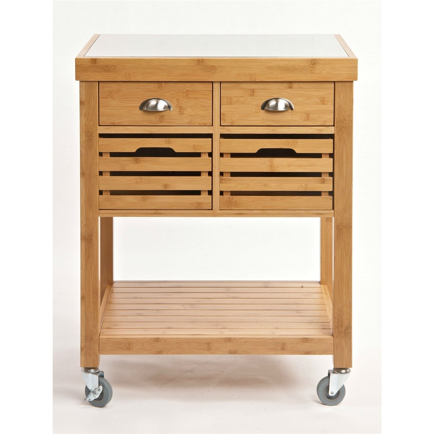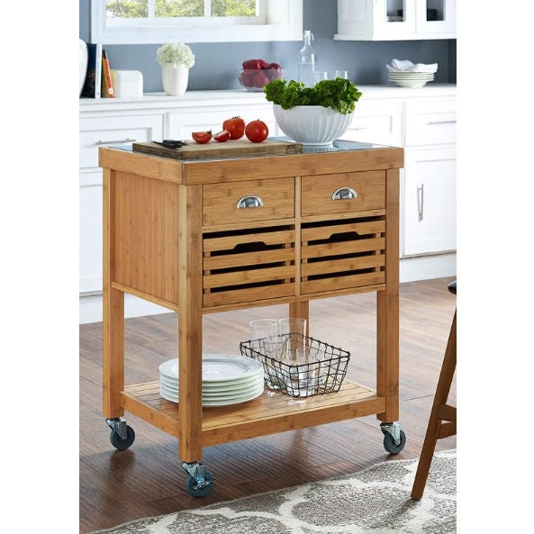 Stainless Steel Top Bamboo Wood Kitchen Cart with Casters Dimensions: 29W x 22D x 36H in. Upper cart made of solid bamboo Bottom storage panel made of MDF wood with paper veneer Stainless steel inset 2 pull-out drawers; 2 pull-out baskets 2-in. metal castors offer easy mobility CARB P2 compliant (California Air Resources Board)