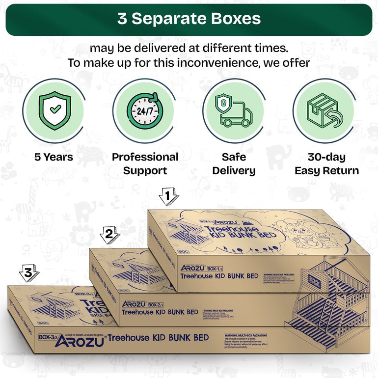 Crafted from solid pine wood with a non-toxic finish, this bunk bed is ASTM certified for anti-tip safety, and also gives parents peace of mind full-length guardrails. The built-in ladder is designed with anti-slip steps for easy and secure access to the top bunk. To make the experience even more magical, your child will discover unique sticker sets hidden in each of the 3 separate boxes, turning delivery into a journey of surprise and creativity.