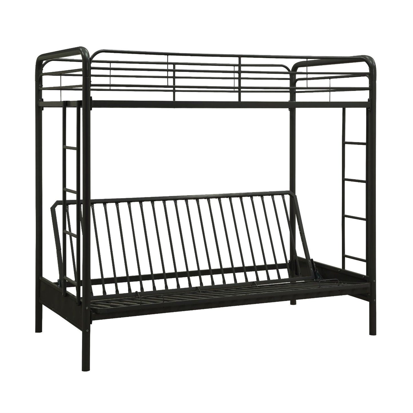 Twin over Full Futon Bunk Bed Sleeper Sofa in Black Metal Black metal finish Designed to maximize space - bottom futon quickly converts to full size sleeper Full length guardrails for upper bunk for added safety Futon and Bed mattresses sold separately Some assembly required