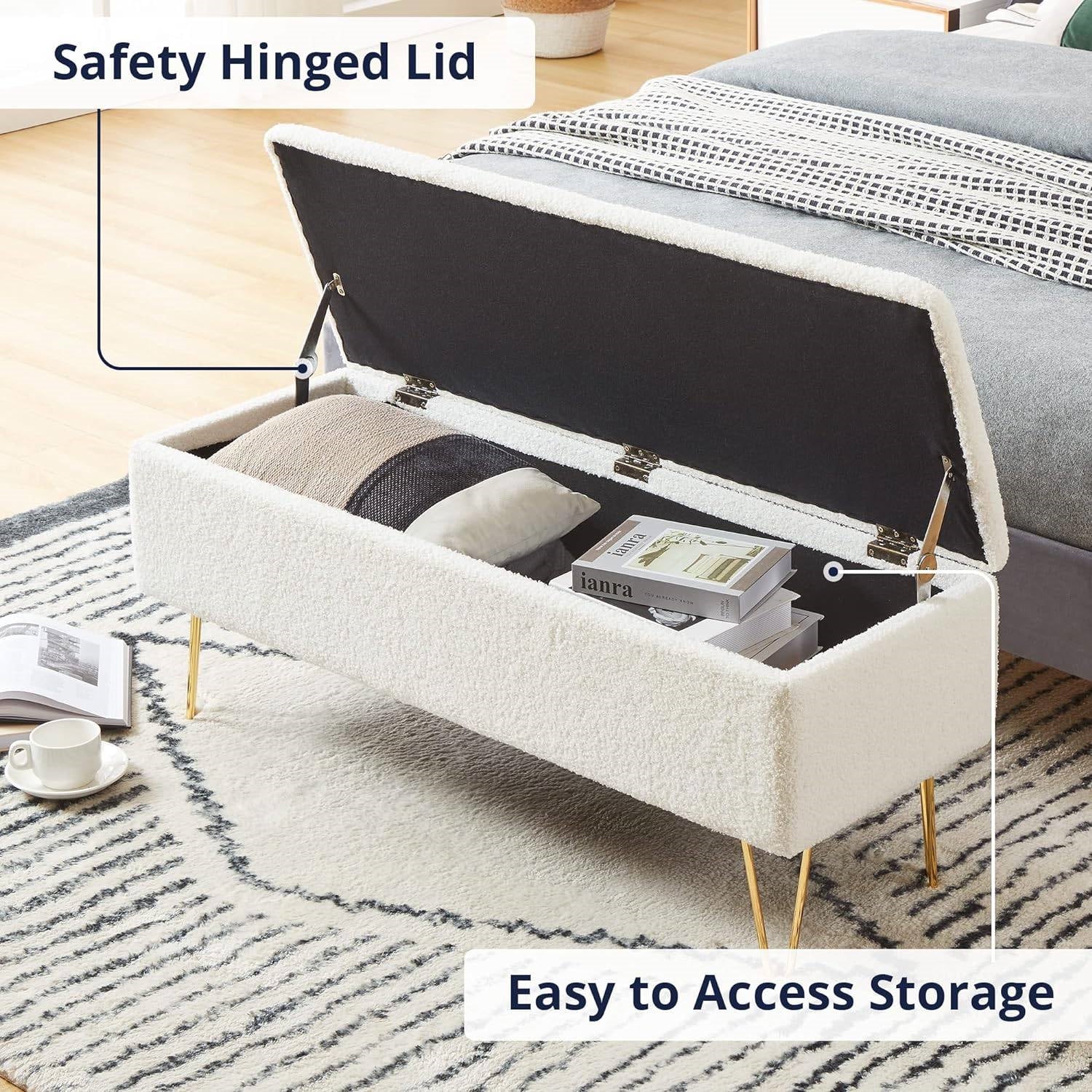 White Sherpa Fabric Upholstered End of Bed Storage Bench with Gold Finish Legs