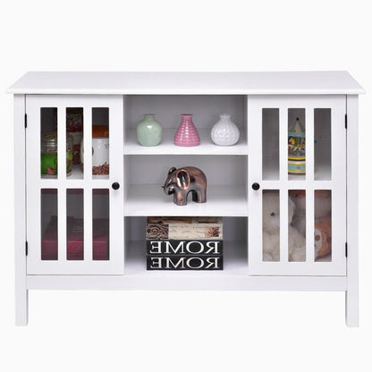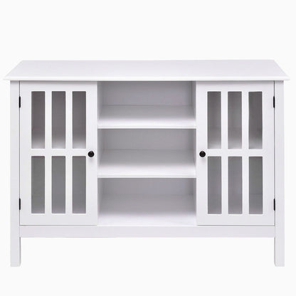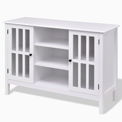 White Wood Sofa Tale Console Cabinet with Tempered Glass Panel Doors Brand new and high quality Accommodates most flat screen TVs up to 45" or up to 80 lbs With both open and closed storage to stow your things With three open shelves for your cable box, gaming console, DVD player, and speakers Behind each door there are two shelves for organizing books, games, and DVDs Simple stylish design in elegant white finish, functional and suitable for any room Fits in your space, fits on your budget Cabinet door features glass window Assembly required Material: Chipboard & MDF & pine & tempered glass Color: As the pictures show Please refer to the picture for more size information Package includes: 1 x Cabinet